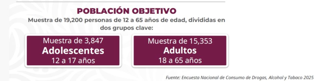 La ENCODAT es la encuesta que se encarga de identificar y analizar los patrones, consumo, frecuencia, dependencia, percepción de riesgo, acceso y su relación con la salud mental y detonantes sociales. Este 2025, se realizó a 19 mil 200 personas de 12 a 65 años de edad, dividida en adolescentes y adultos.