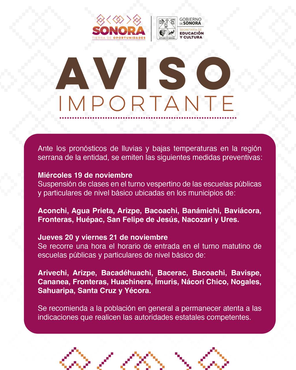 Hermosillo, Sonora; 19 de noviembre 2025.- La Secretaría de Educación y Cultura (SEC) informa que se suspenden clases en el turno vespertino de las escuelas públicas y particulares de nivel básico ubicadas en los municipios de Aconchi, Agua Prieta, Arizpe, Bacoachi, Banámichi, Baviácora, Fronteras, Huépac, San Felipe de Jesús, Nacozari y Ures.