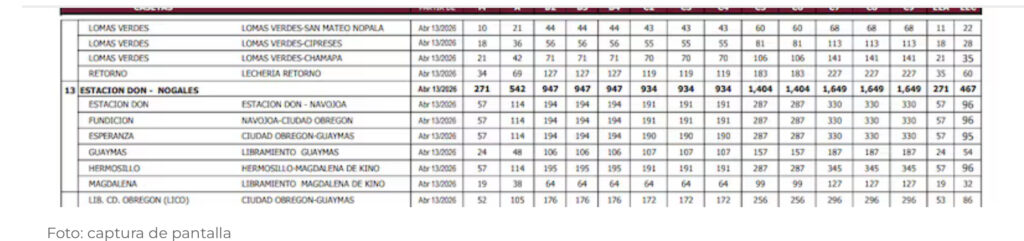 Entre los tramos con mayores aumentos destacan Estación Don, Navojoa–Ciudad Obregón, Ciudad Obregón–Guaymas y Hermosillo–Magdalena de Kino, donde los ajustes para usuarios en general oscilan entre los 3 y 31 pesos.