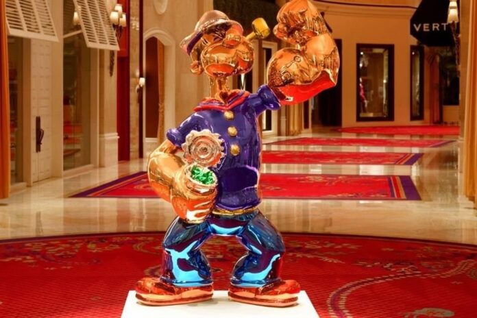 El Popeye original es de acero inoxidable pulido a espejo, actualmente ubicado en la Explanada del Wynn, en Las Vegas. Crédito: Especial