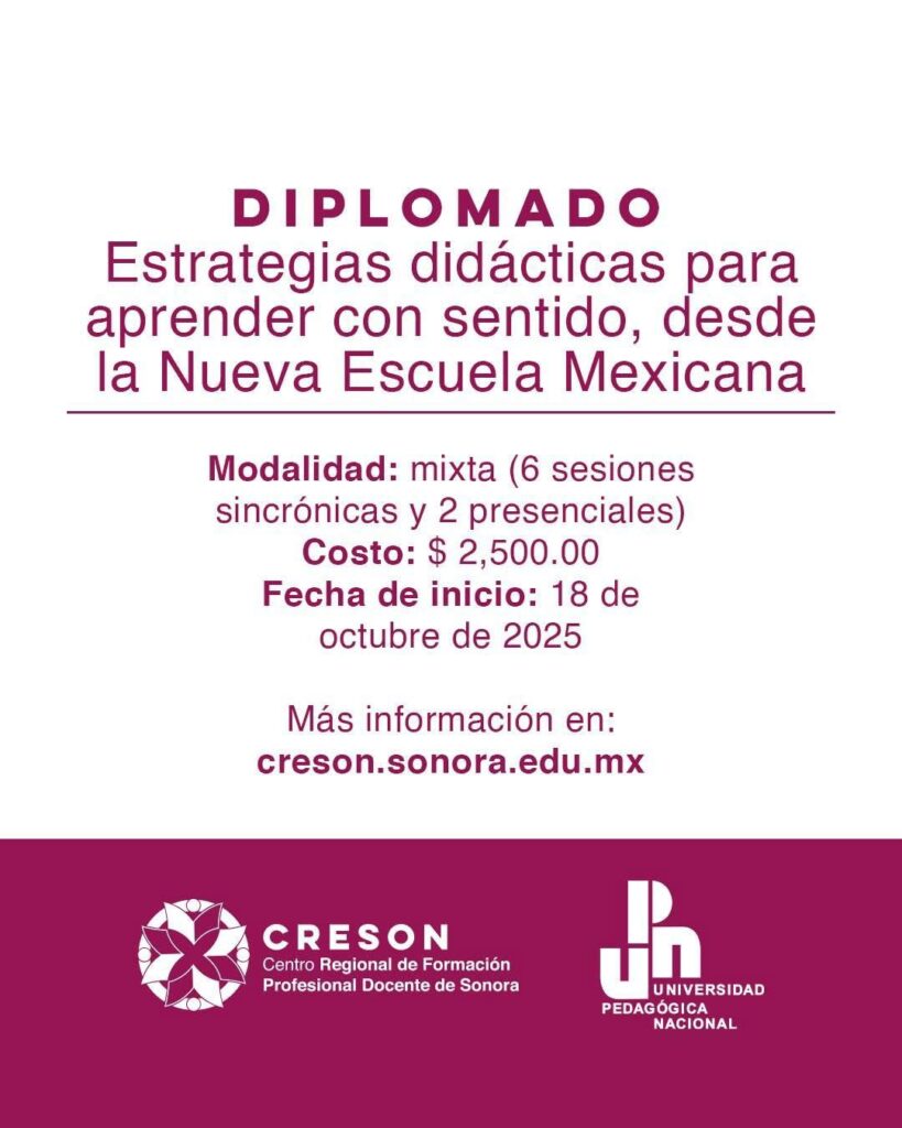 Hermosillo, Sonora. Para ofrecer herramientas pedagógicas actualizadas y alineadas con los principios de la Nueva Escuela Mexicana, el Centro Regional de Formación Profesional Docente de Sonora (Creson) y la Universidad Pedagógica Nacional, Plantel Hermosillo, invitan al nuevo diplomado dirigido a docentes y profesionales de la educación, especialmente del nivel básico.