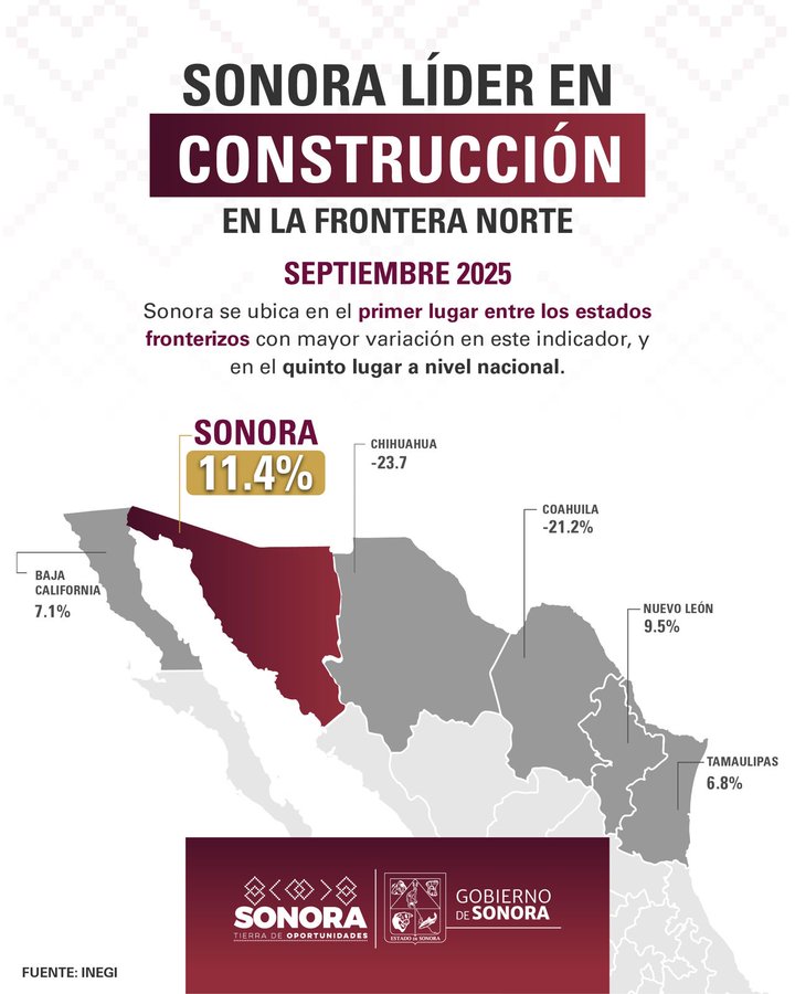 El mandatario estatal señaló que, con base en la Encuesta Nacional de Empresas Constructoras (ENEC), publicada por el Instituto Nacional de Estadística y Geografía (Inegi), Sonora registró importantes avances en el sector de la construcción durante septiembre de 2025, consolidándose como una de las entidades con mayor dinamismo en esta industria clave para la economía estatal.
