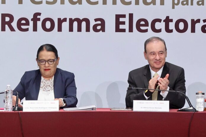 Hermosillo, Sonora; 8 de octubre de 2025.- Con la finalidad de conocer las opiniones y propuestas sobre temas específicos de los diferentes sectores de la sociedad para la construcción de un proyecto de Reforma Electoral, acorde a las condiciones actuales en México, el gobernador Alfonso Durazo Montaño y la secretaria de Gobernación, Rosa Icela Rodríguez Velázquez, encabezaron los trabajos de la Comisión Presidencial para la Reforma Electoral.