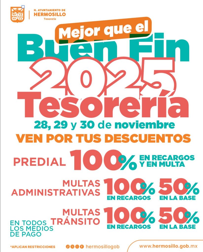 Hermosillo, Sonora; 25 de noviembre, 2025.- La última promoción del año “Mejor que el Buen Fin 2025” lanzará Tesorería Municipal los días 28, 29 y 30 de noviembre donde las y los contribuyentes podrán ponerse al corriente con sus pagos.